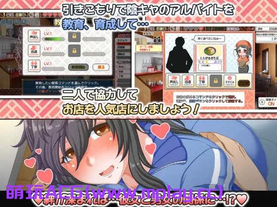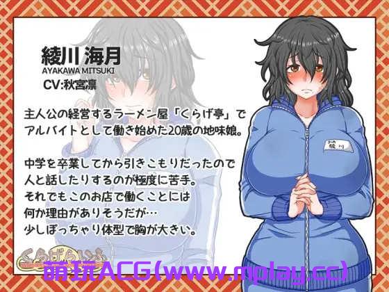 为了偿还债务,你必须一边管理拉面店,一边培训一名不起眼的兼职女工。这是一款 SLG 游戏,在游戏中,您要一边管理拉面店,一边培训兼职员工以偿还债务。在日常生活中在日常生活中,进行培训和销售。提高店铺的人气!与女主角交流时你们之间可能会产生浪漫的情愫……